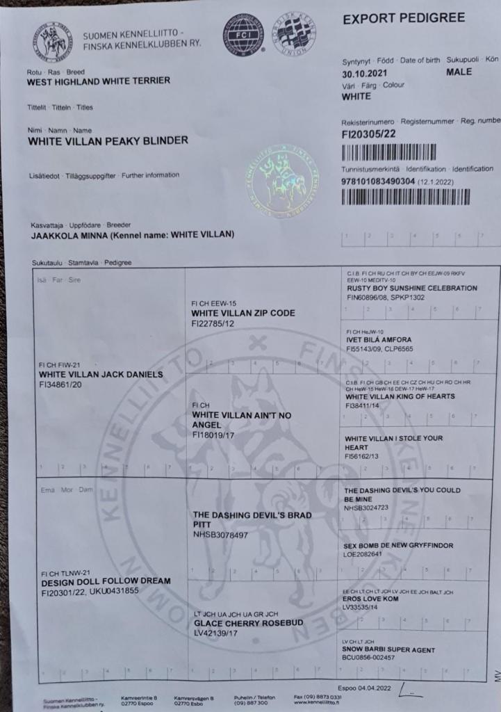 PADRE CH WHITE WILLAN PEAKY BLINDER. Mejor cachorro exposicion mundo, Ch J. España,Ch. España MADRE ORISSA DE VILLACRESCAN. Hija del ch España GALAN DE NOCHE DE NEW GRYFFINDOR