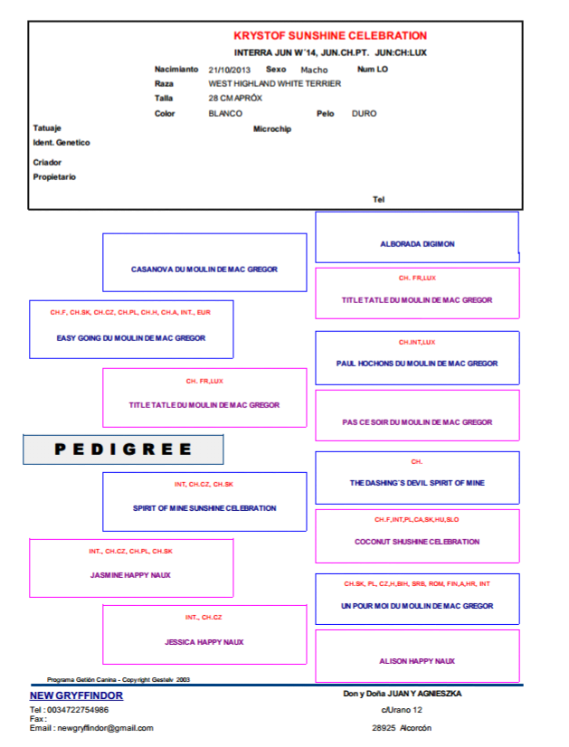 Camada nacida el 25 de Abril. La Foto y pedigree son del Padre Krystof Sunhine Celebration, propiedad de New Gryffindor ( Agnietszka Kyrszak y Juan del Pino. Madre Kristen de summerptah ( foto y pedigree apartado hembras)