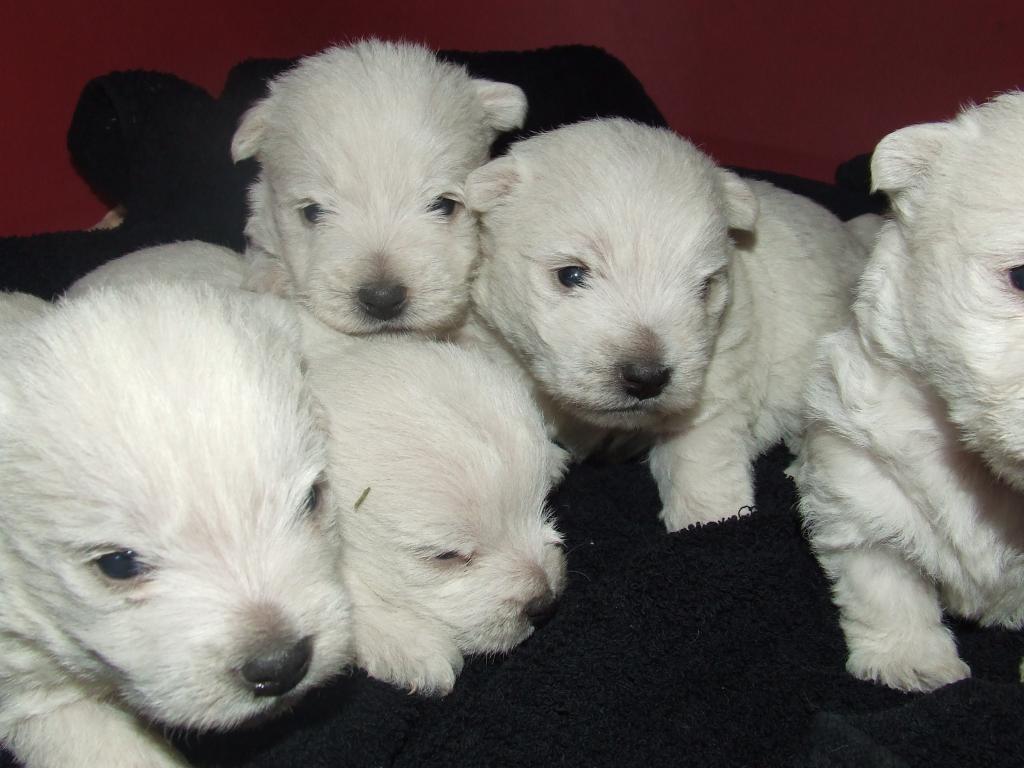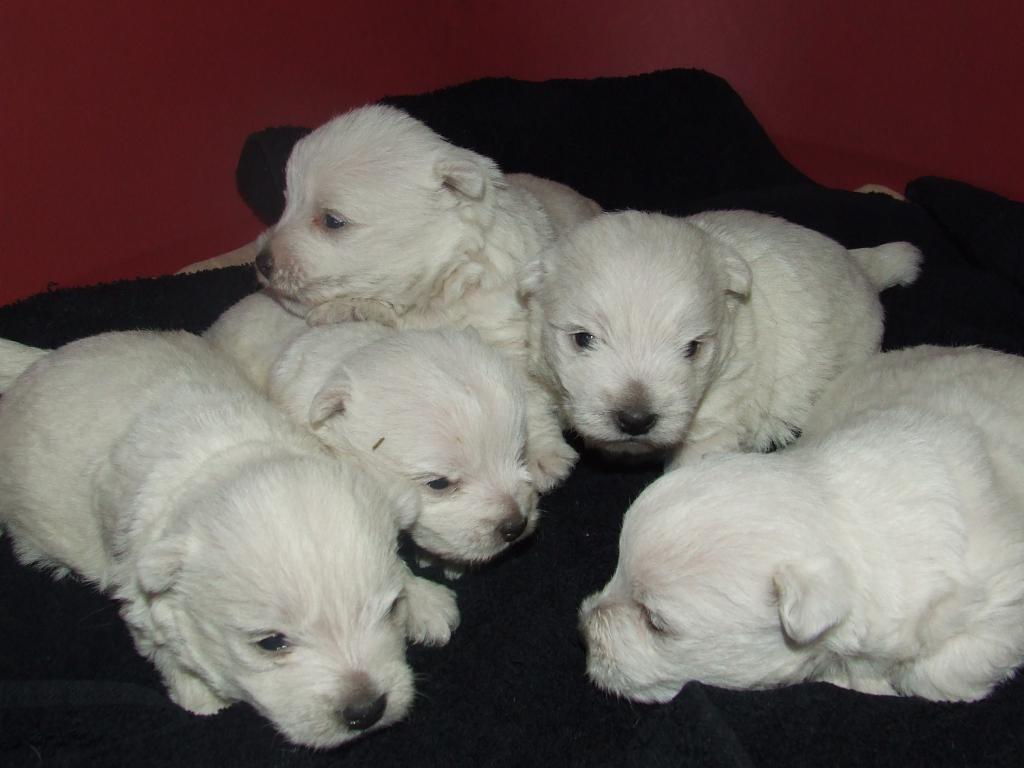 El 18 de Mayo ha nacido la camada de West highland white terrier del campeón Alborada Henrich con nuestra preciosa Valery de Summer Path, hija de Napoleon Urwiska , y nieto del multicampon IM THE BEST superbia. La camada esta compuesta de 3 machos y 2 hembras . Estas son sus primeras fotos